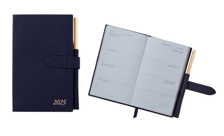 This might just be a “me” thing, but I’m old school and prefer to physically write things down; it helps me stay organized. Every year, I restock on the pocket-sized Smythson Panama diary (with a fancy pencil) because it’s so easy to carry around and fits into all my tiny bags. It’s especially useful when I’m traveling because I can never keep track of what day it is on a trip (can you?). Since I’m always working while I’m away, I have calls at odd hours with clients and editors across different time zones—a fact my phone calendar simply can’t keep up with (it’s messed me up more times than I’d like to admit).