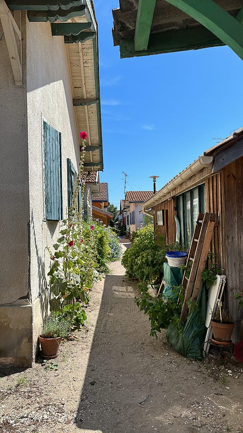 Visit L’Herbe, a tiny, postcard-pretty oyster village on the peninsula, known for its colorful wooden cabins, quiet beach, and laid-back, old-school Arcachon Basin vibe.
